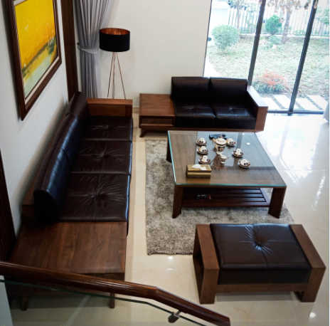 Bộ ghế sofa và bàn trà được làm bằng gỗ óc có thể được coi là đồ nội thất cao cấp trong trang trí nội thất phòng khách giúp không gian trở nên sang trọng hơn. Những bộ bàn ghế sofa bằng gỗ hầu hết phù hợp với những căn nhà ở hiện đại hoặc mang phong cách Á Đông. Màu nâu của gỗ kết hợp với màu xanh của lá cây thường được nhiều người lựa chọn trong thiết kế không gian không chỉ mang ý nghĩa về phong thủy – sinh sôi phát đạt- mà kiểu trang trí phòng khách như thế còn thuận theo quy luật tự nhiên.
