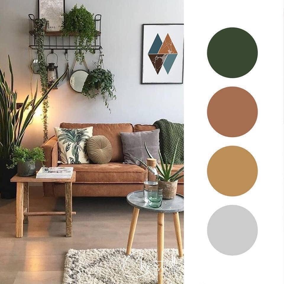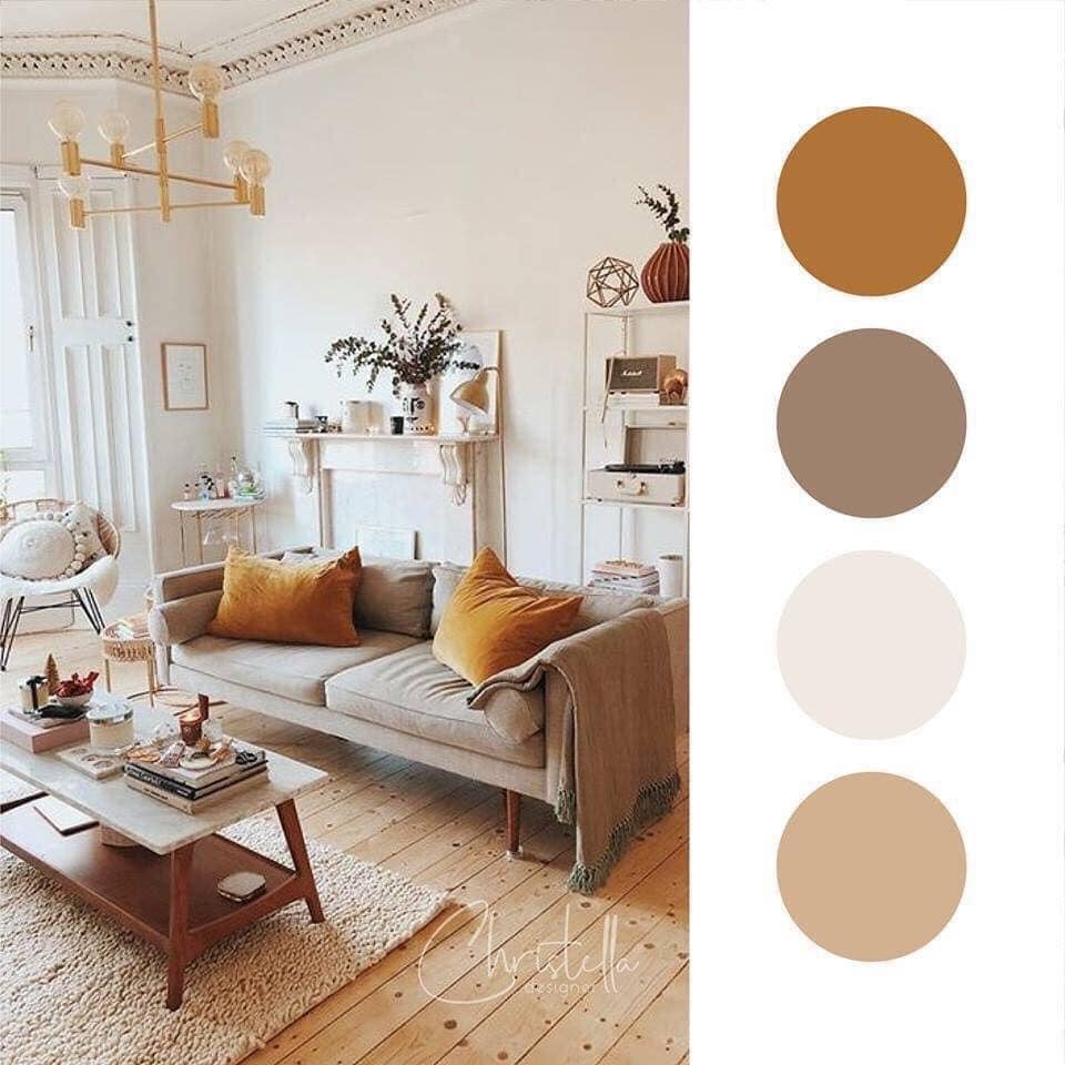 Cách phối màu cho phòng khách nhỏ này cho phép bạn tạo ra một bầu không khí gần gũi với thiên nhiên, như đang ở một vùng ngoại ô. Việc sử dụng màu sắc tự nhiên ấm áp giúp tạo ra bầu không khí dễ chịu, thoải mái trong phòng khách. Điều này đặc biệt đúng khi trang trí phòng sử dụng các vật liệu tự nhiên như tấm tường bằng gỗ.