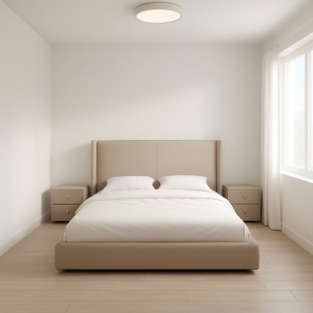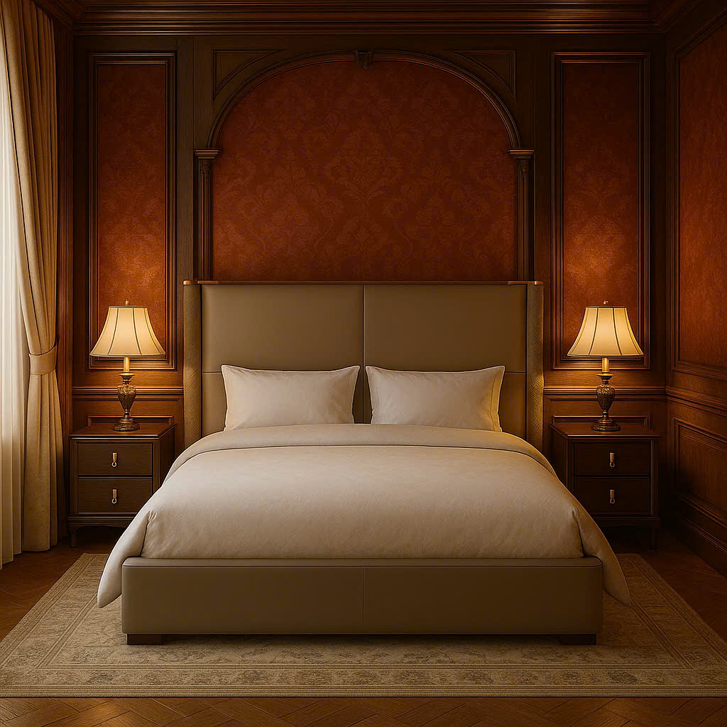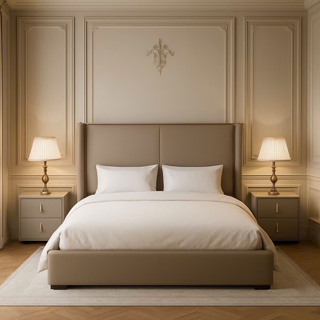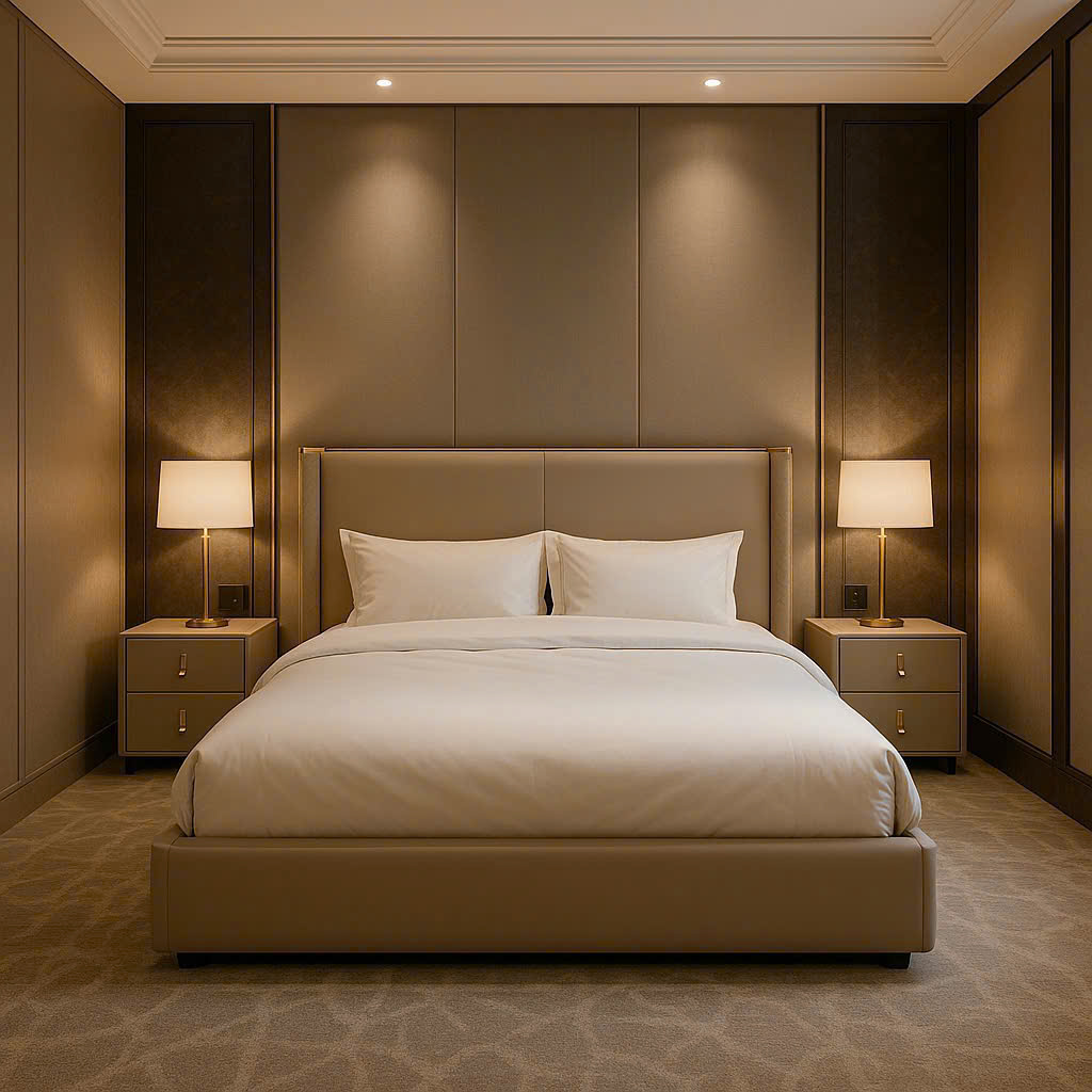 Phong cách: Giường cao cấp, nệm dày, ánh sáng vàng ấm, vách đầu giường bọc nỉ sang trọng.