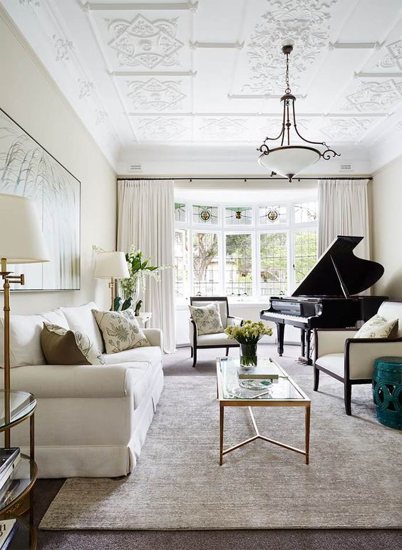 Căn phòng khách này dành cho những gia chủ có tâm hồn yêu nghệ thuật, hoặc hướng cho con cái của mình theo con đường nghệ thuật đặc sắc. Đầu tiên của phòng khách được chúng tôi thiết kế với một cây đàn piano đầy tính nghệ thuật. Đi sâu vào bên trong là chính giữa của phòng khách thì được chúng tôi tôi thiết kế một bộ bàn ghế salon màu vàng kem tỏa rạng trong thứ ánh sáng tuyệt vời của tự nhiên thông quá tấm kính lớn. Chắc chắn với sự khéo léo khi sắp xếp đồ đạc như thế này sẽ mang đến một không gian rất tự nhiên cho gia đình, mang lại cảm giác thư thái sau một ngày làm việc mệt mỏi, áp lực. Tiếng đàn piano cất lên cùng với những giai điệu du dương chắc chắn sẽ là một liều thuốc hoàn hảo cho các thành viên gia đình.