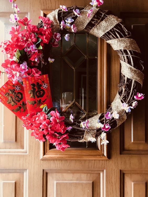 Ý tưởng trang trí Tết Nguyên đán với vòng hoa Tết chưa bao giờ lỗi thời mà khá được ưa chuộng bởi mang đến không gian một mùa xuân theo cách khác nhau của mỗi người. Một vòng hoa Tết với hoa đào, hoa mai gắn thêm một vài cành khô hoặc tạo thành vòng tròn cửa dù không cầu kỳ, không mất quá nhiều công sức nhưng chắc chắn sẽ giúp năm mới tươi vui, ấm cúng.